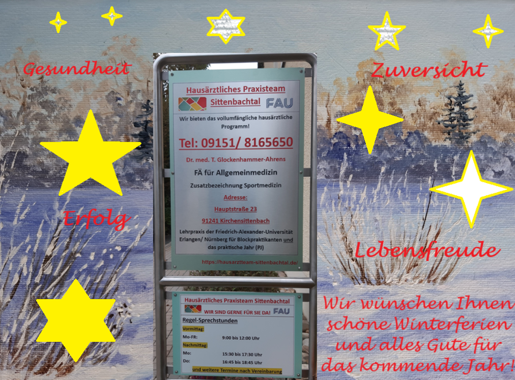 Die Praxis konnte im Dezember 2024 aufgrund ihres Versorgungsstatus personen- und standortbezogen als Lehrpraxis der Universität Erlangen-Nürnberg qualifiziert werden. Dies gilt sowohl für die Ausbildungsabschnitte für Blockpraktikanten als auch für die Studierenden des letzten universitären Abschnittes im praktischen Jahr (PJ). Wir nehmen seit 2025 die Studenten im Rahmen unseres Lehrauftrages gerne an und begrüßen unsere künftigen ärztlichen Kolleginnen und Kollegen in der Gemeinde herzlich!
